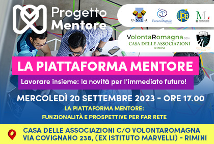 Con la prossima tappa dell’Azione di Animazione il Progetto Mentore arriva in Emilia-Romagna. Mercoledì 20 settembre i referenti nazionali del Progetto saranno a Rimini per confrontarsi con ETS ed Enti Pubblici. L’incontro “La Piattaforma Mentore: funzionalità e prospettive per fare Rete” è organizzato dall’Università Aperta Masina & Fellini APS, in collaborazione con la Volontà Romagna ODV Casa delle Associazioni di Rimini.